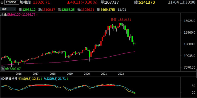 同樣的看台灣加權指數也是一樣,打開月K圖,月KD指標也是很低檔,都是值得價投的好部位。